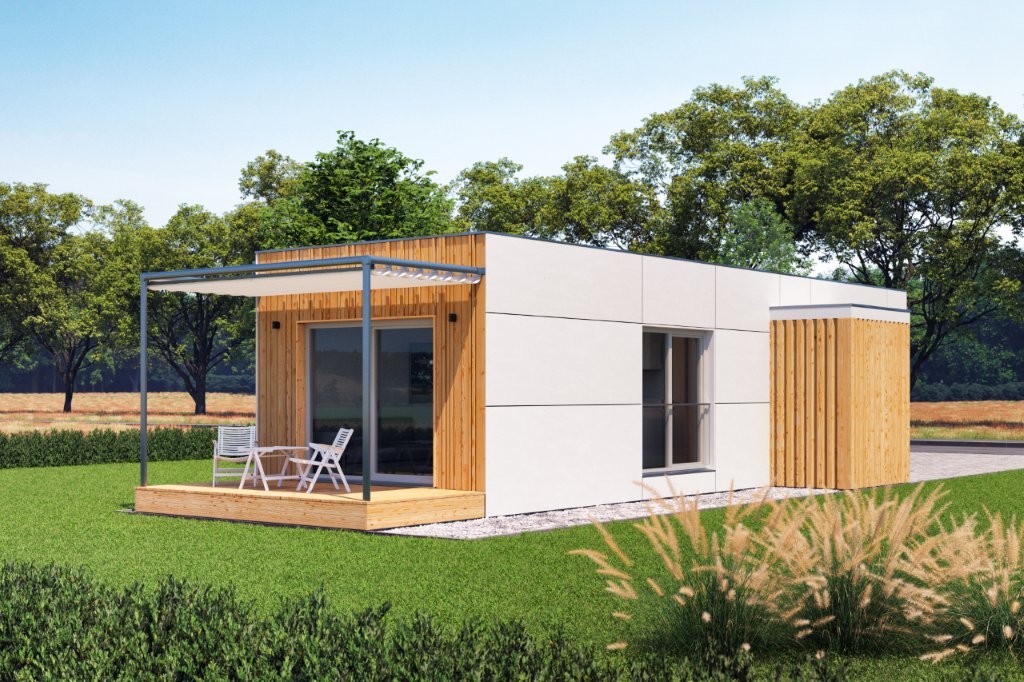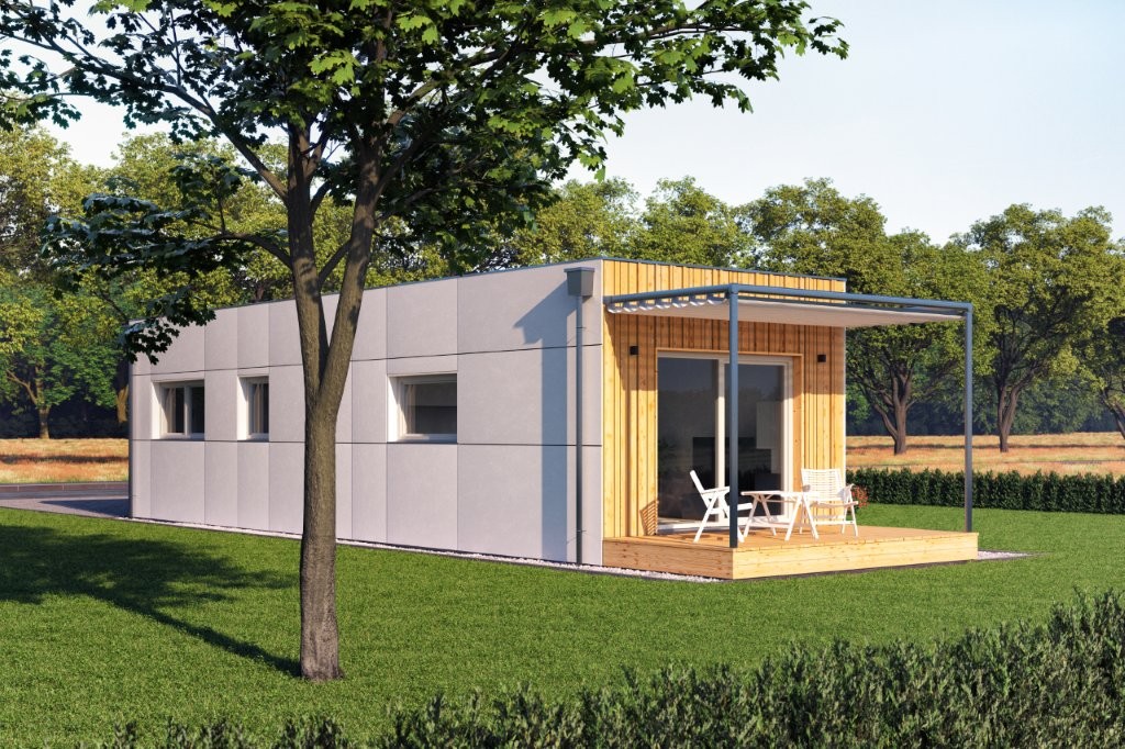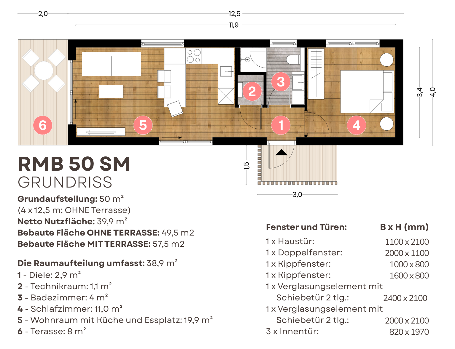 Das RMB 50 Sondermodul hat eine bebaute Gesamtfläche von 50,00 m2 (12,5 x 4,0 m; OHNE Terrasse) und eine Wohnfläche von 39,9 m² (netto) und ist die perfekte Lösung sowohl für ein dauerhaftes Zuhause für zwei Personen als auch für ein Ferienhaus am Meer, in den Bergen, im Weinberg oder anderswo.